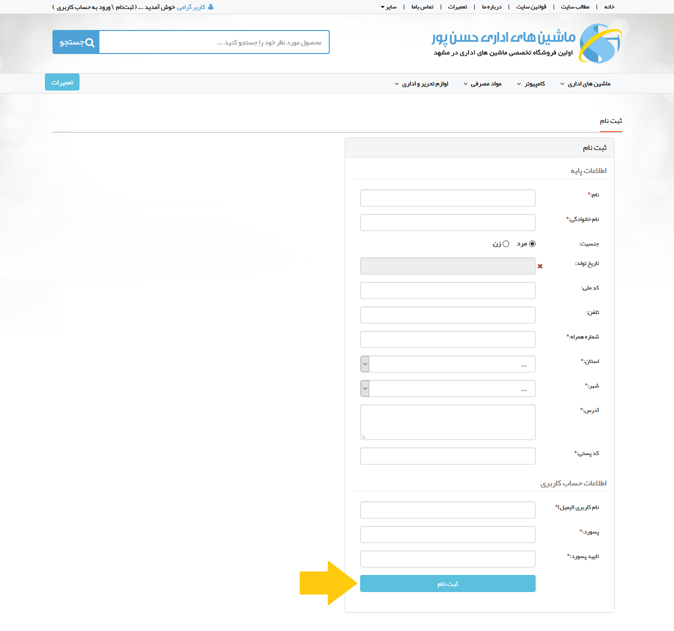 برای شروع فرایند خرید از فروشگاه اینترنتی حسن پور،  ابتدا پیشنهاد می شود که اقدام به ثبت نام و یا ورود به سایت نمایید. برای ثبت نام می توانید از قسمت بالا سمت چپ صفحه (تصویر