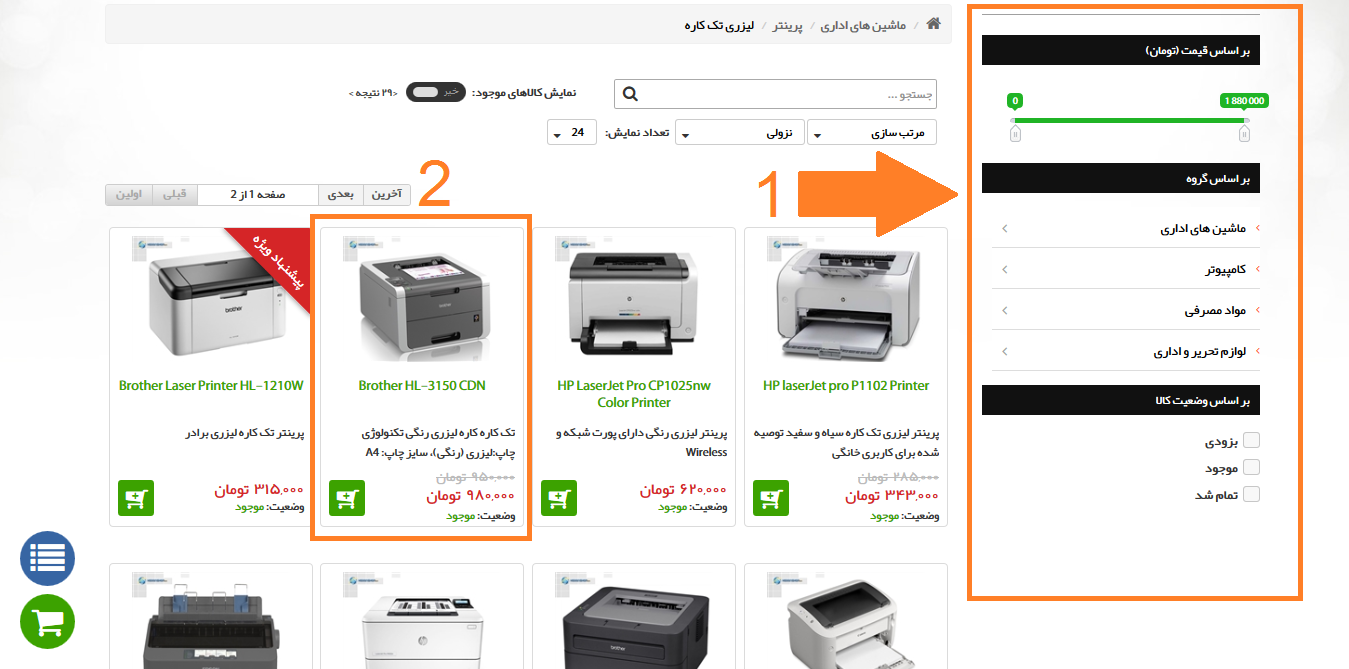 در صفحه باز شده شما می توانید با استفاده از منو سمت راست (بخش 1 تصویر زیر) بر اساس دسته بندی ها و فیلترهای مشخص شده کالای مد نظر خود را راحت تر پیدا کنید. سپس (همانند