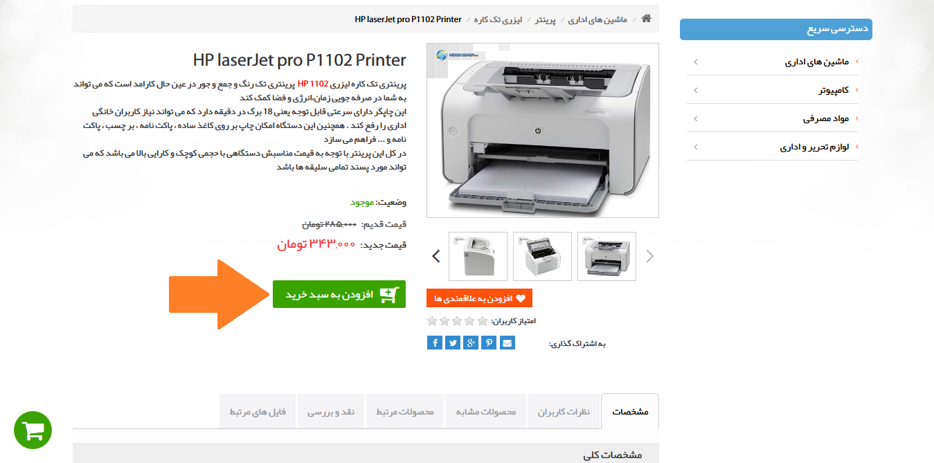 در صفحه ی کالای مورد نظر شما با استفاده از دکمه سبز رنگ افزودن به سبد خرید، می توانید کالا را انتخاب کنید.