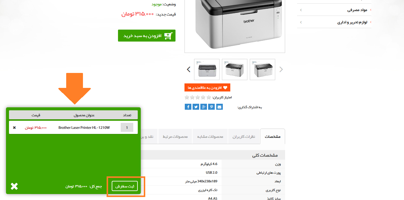 بعد از اضافه کردن کالا به سبد خرید پنجره سبز رنگی در گوشه پایین سمت چپ باز شده که به شما کالاهای موجود در سبد خرید را نمایش می دهد. شما می توانید با کلیک روی دکمه ثبت