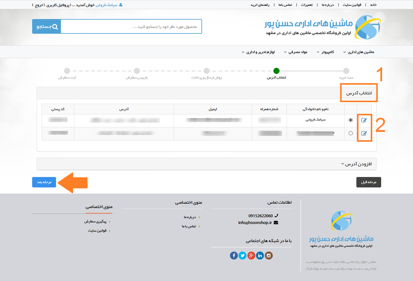 انتخاب شده است اما در صورتی که نیاز به درج آدرس جدیدی دارید می توانید با کلیک روی دکمه افزودن آدرس (شکل 1) آدرس جدید را وارد کنید. همچنین با کلیک بر روی دکمه ویرایش