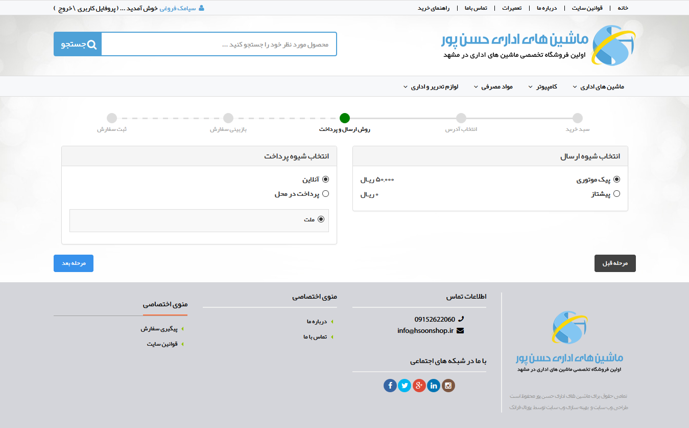 در مرحله روش ارسال و پرداخت، شیوه ارسال کالا و شیوه پرداختی مد نظر را انتخاب کرده و سپس بر روی دکمه آبی رنگ مرحله بعد کلیک نمایید.