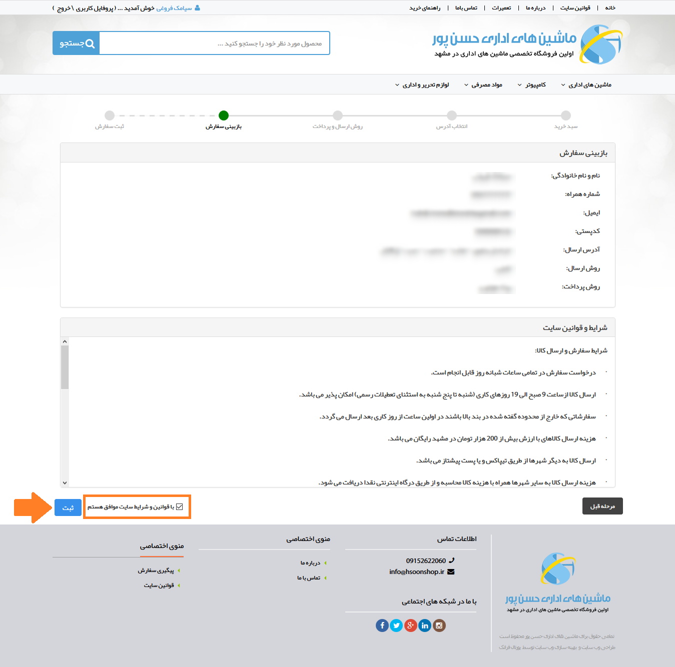 در مرحله بعد سفارش خود را باز بینی کرده و بعد ازکسب اطمینان از صحت اطلاعات و مطالعه قوانین سایت، با کلیک روی جعبه "با قوانین و شرایط سایت موافق هستم" و سپس روی دکمه ثبت
