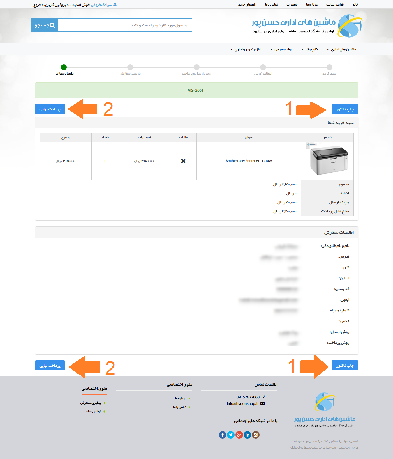 در گام آخر فاکتور سفارش به شما نمایش داده خواهد شد که می توانید آن را چاپ کنید. (شکل 1) پس از مشاهده فاکتور بر روی دکمه پرداخت نهایی (شکل 2) کلیک کنید تا به سایت بانک برای